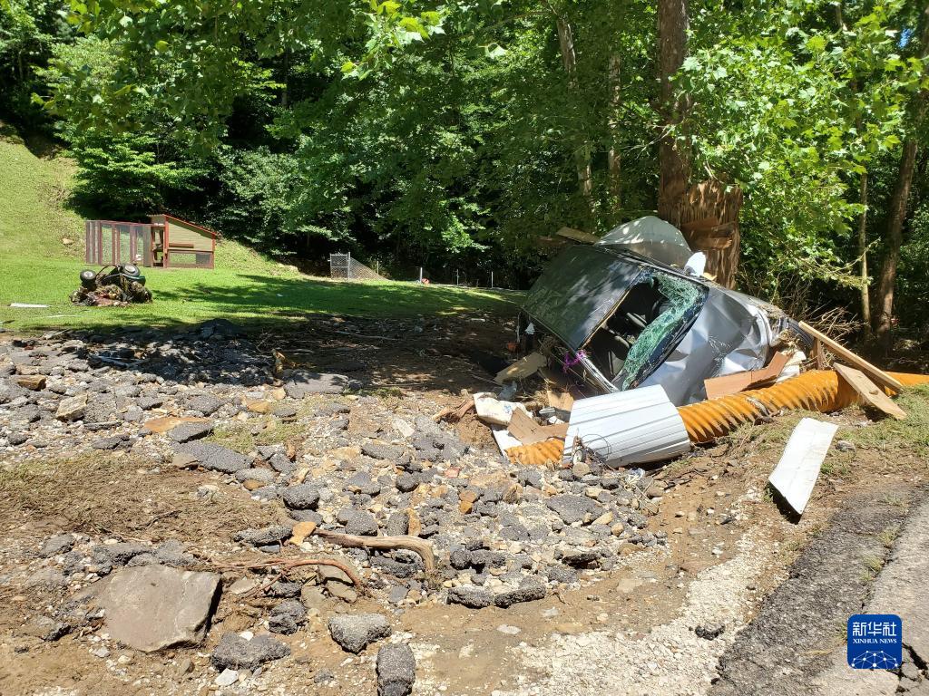 这是7月30日在美国肯塔基州东部阿巴拉契亚山区拍摄的被损毁的汽车。