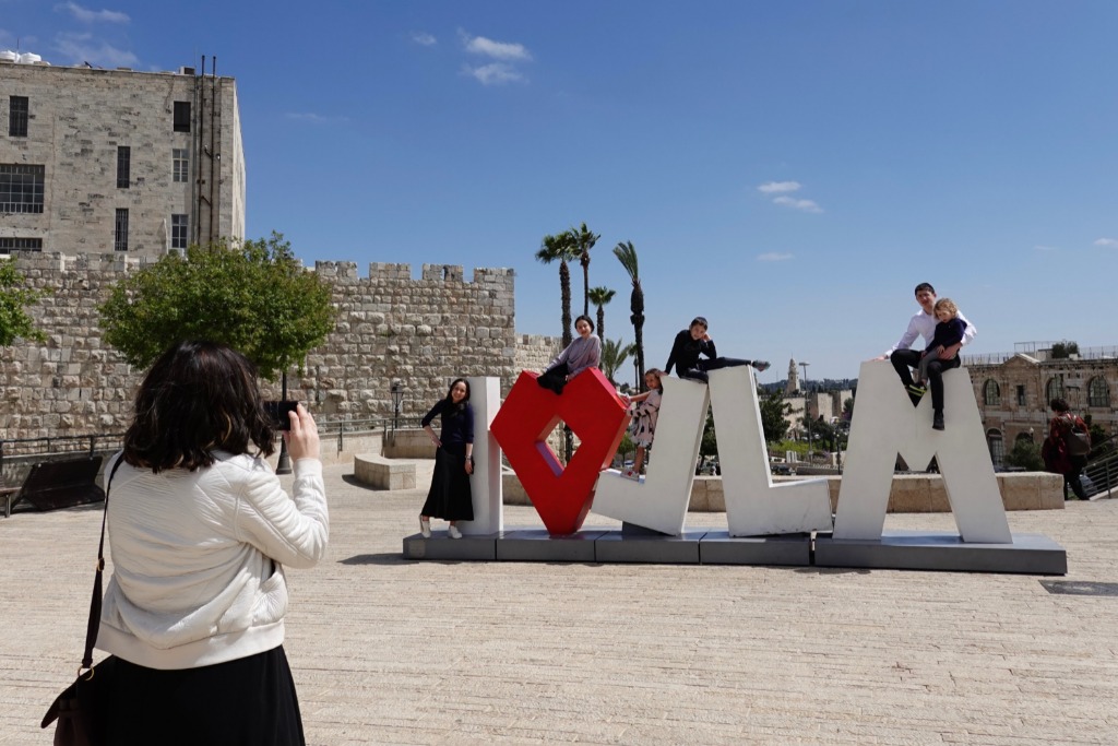 4月12日,游客在耶路撒冷老城附近留影。新华社记者王卓伦摄