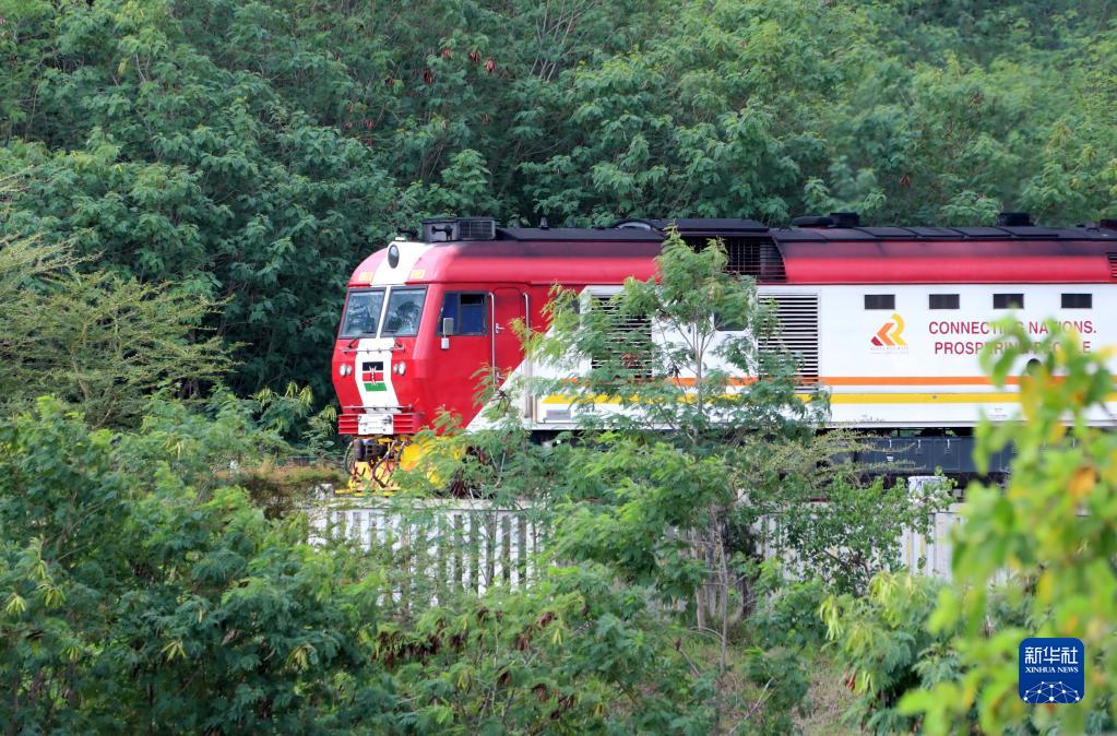 7月27日,在肯尼亚蒙巴萨,一列货运列车行驶在蒙内铁路线上。