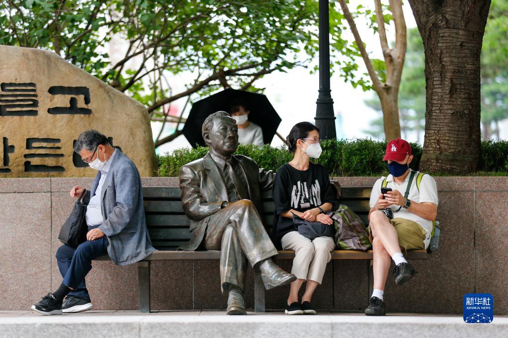 8月3日,人们佩戴口罩在韩国首尔一处公园休息。