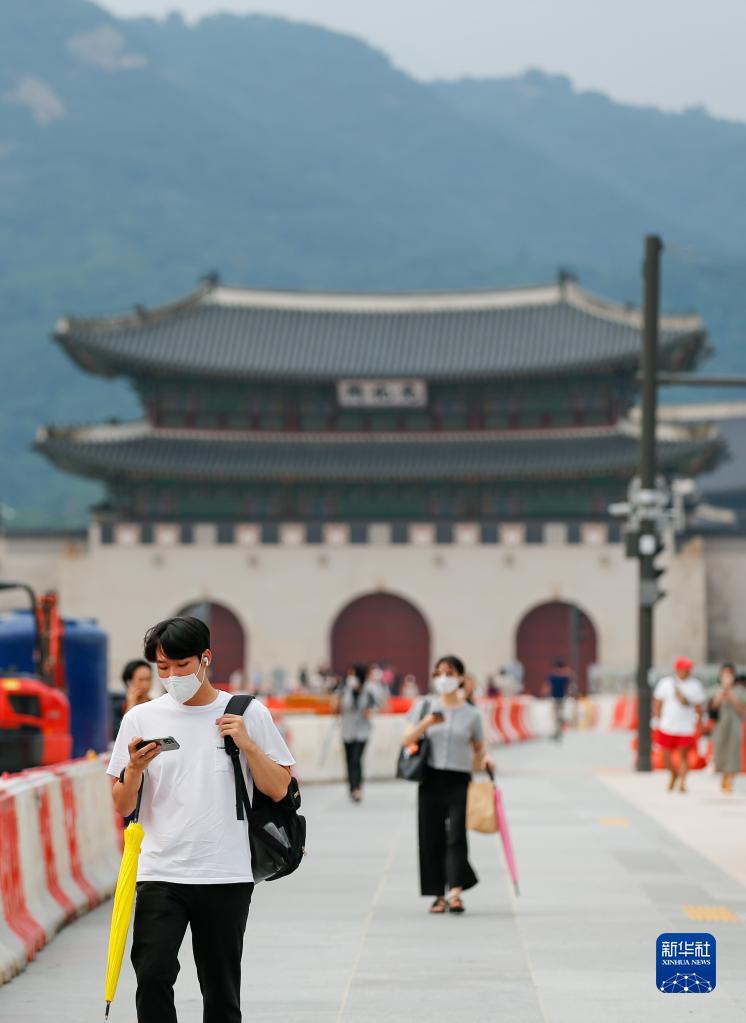 8月3日,行人佩戴口罩走在韩国首尔光化门广场。
