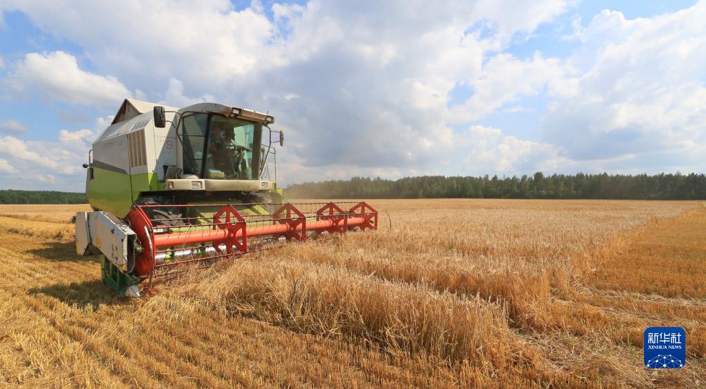 这是8月4日在白俄罗斯明斯克州拍摄的大麦收割场景。