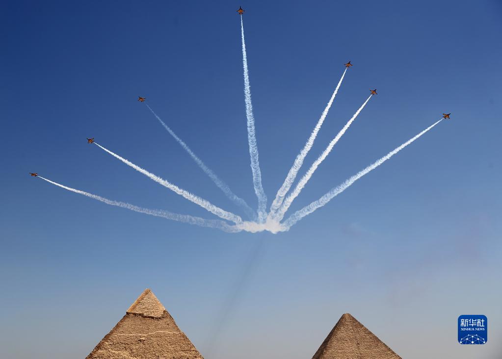 当日,埃及2022金字塔航空表演在吉萨金字塔景区举行,来自埃及和韩国的多个飞行表演队伍进行了多项精彩的飞行表演。