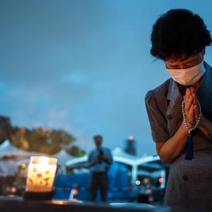 8月6日,一名女子在日本广岛和平纪念公园的和平都市纪念碑前祈祷。