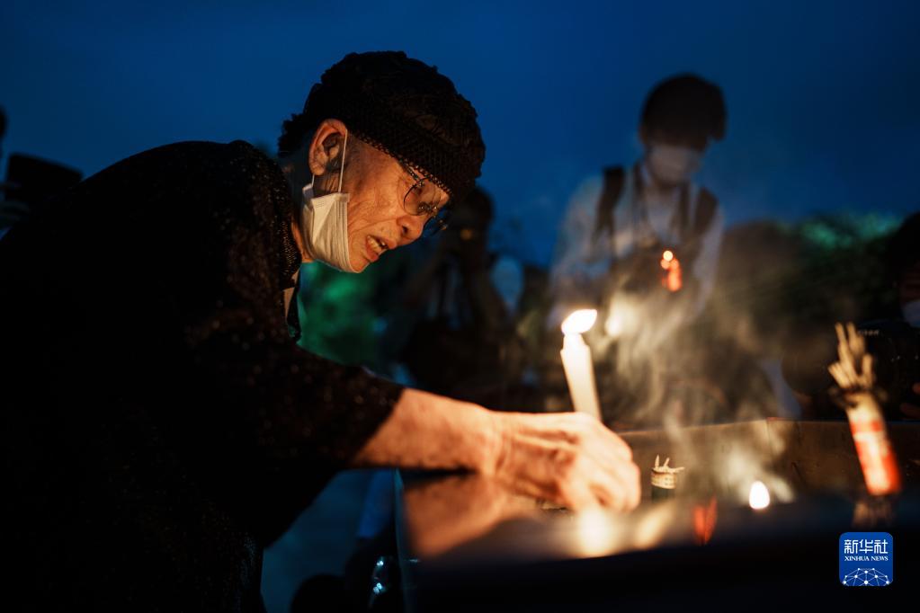 8月6日,一位老人在日本广岛和平纪念公园的和平都市纪念碑前点燃蜡烛。