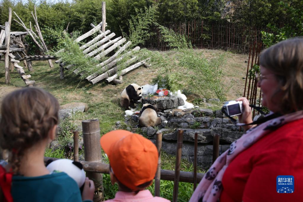 8月6日,在比利时布吕热莱特的天堂动物园,观众观看大熊猫“宝弟”(左)、“宝妹”享用“生日大餐”。