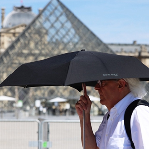 7月13日,游客在法国巴黎卢浮宫博物馆玻璃金字塔广场上撑伞遮阳。新华社记者高静摄