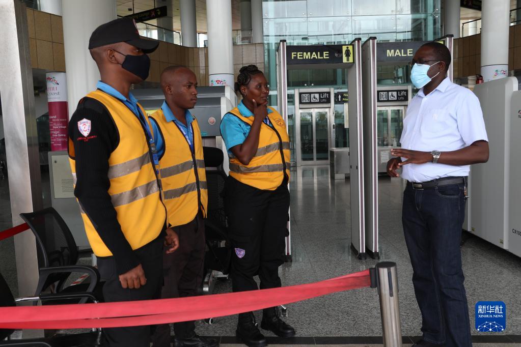 7月27日,肯尼亚蒙内铁路蒙巴萨终点站站长科斯马斯(右)在站内与安检员交谈。