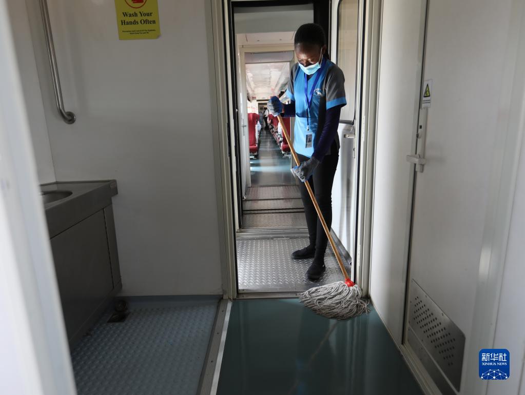 7月29日,清洁工莫希在肯尼亚蒙内铁路客运列车上打扫卫生。
