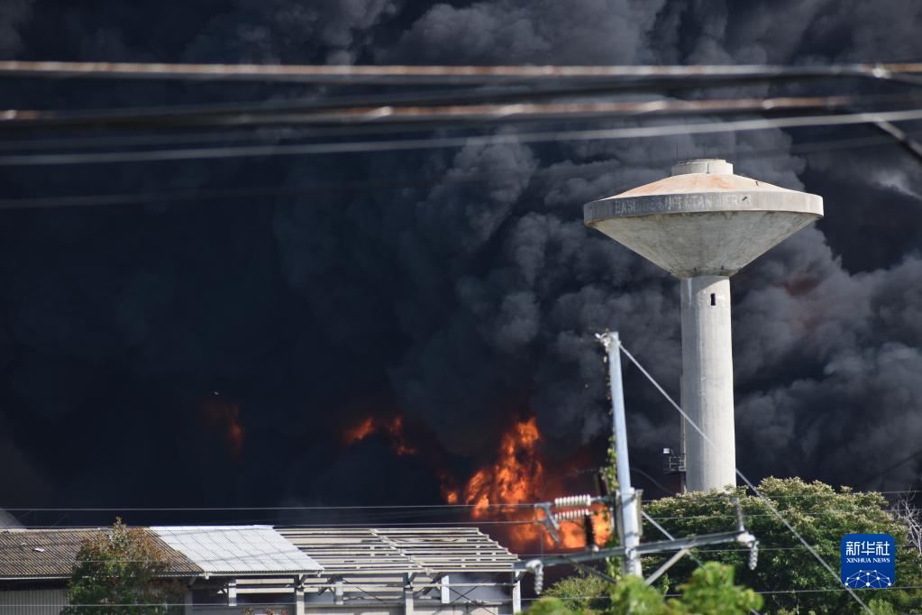 8月7日,古巴马坦萨斯省火灾现场的储油罐继续燃烧并冒出浓烟。