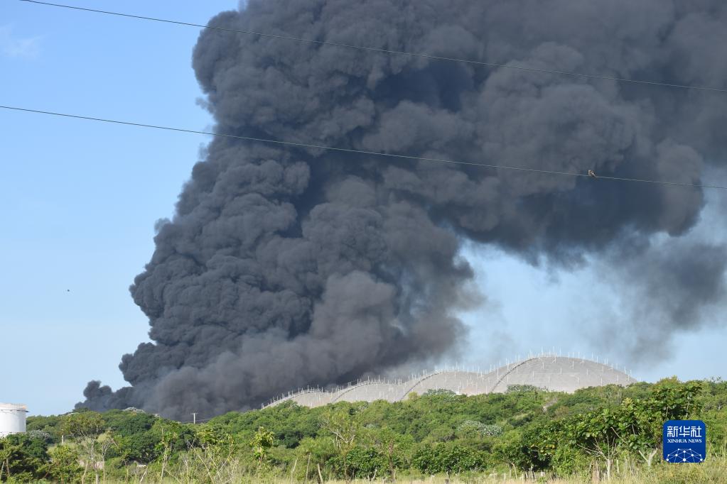 8月7日,古巴马坦萨斯省火灾现场的储油罐继续燃烧并冒出浓烟。
