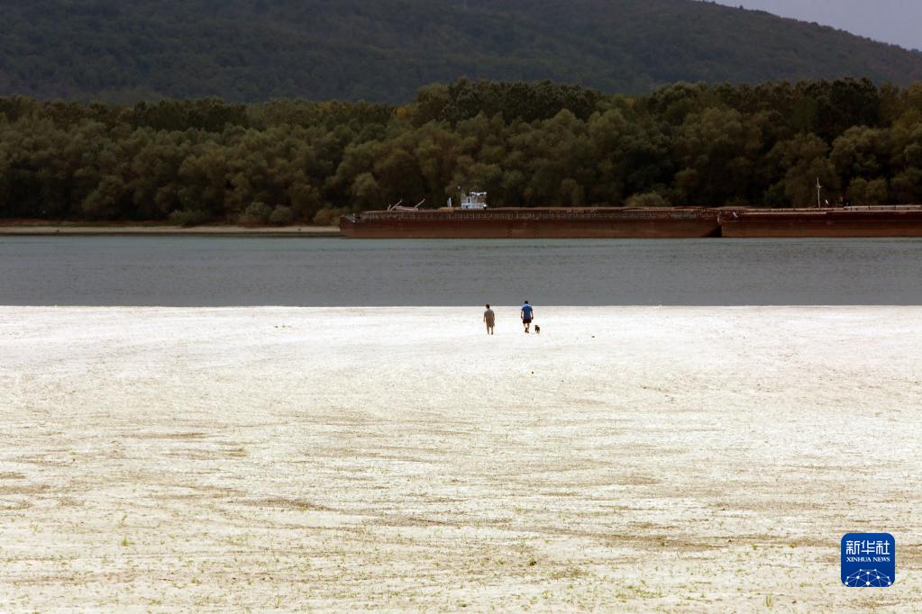 8月7日,在罗马尼亚泰莱奥尔曼县,人们走在裸露的多瑙河河床上。
