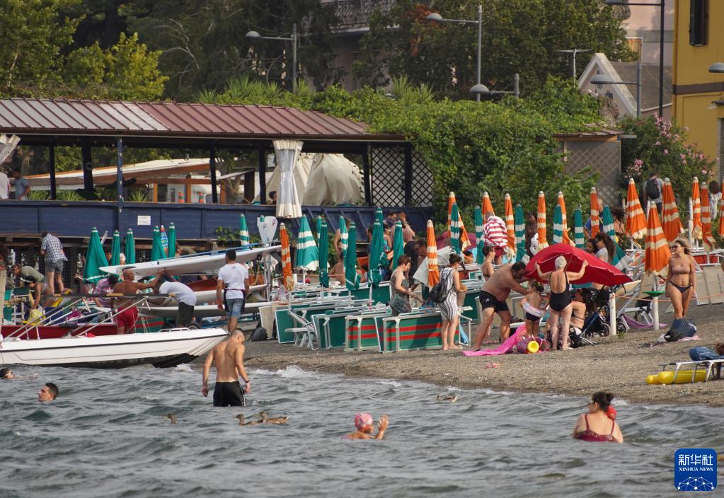 8月7日,游客在意大利布拉恰诺湖戏水休闲。