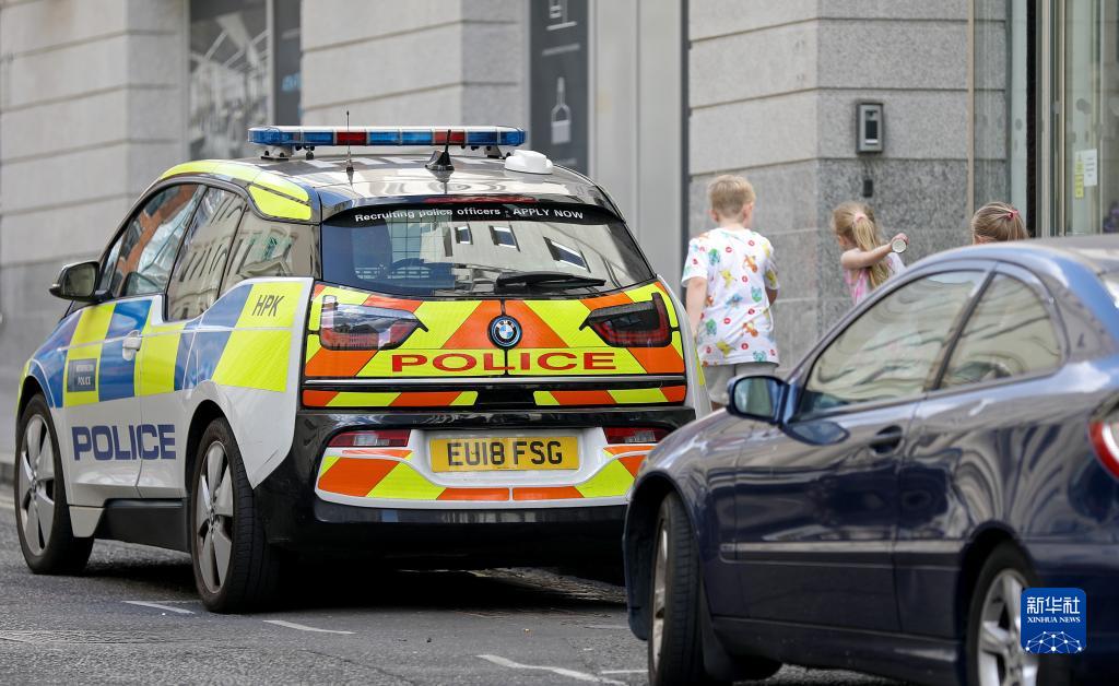 8月8日,几名儿童从英国伦敦街头的警车旁走过。
