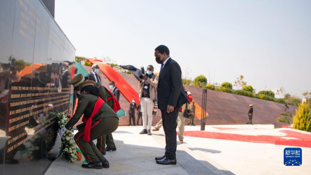 8月10日,在赞比亚卢萨卡省琼圭地区的坦赞铁路纪念园,赞比亚总统希奇莱马(前右)向为修建坦赞铁路等项目而牺牲的中方人员敬献花圈。