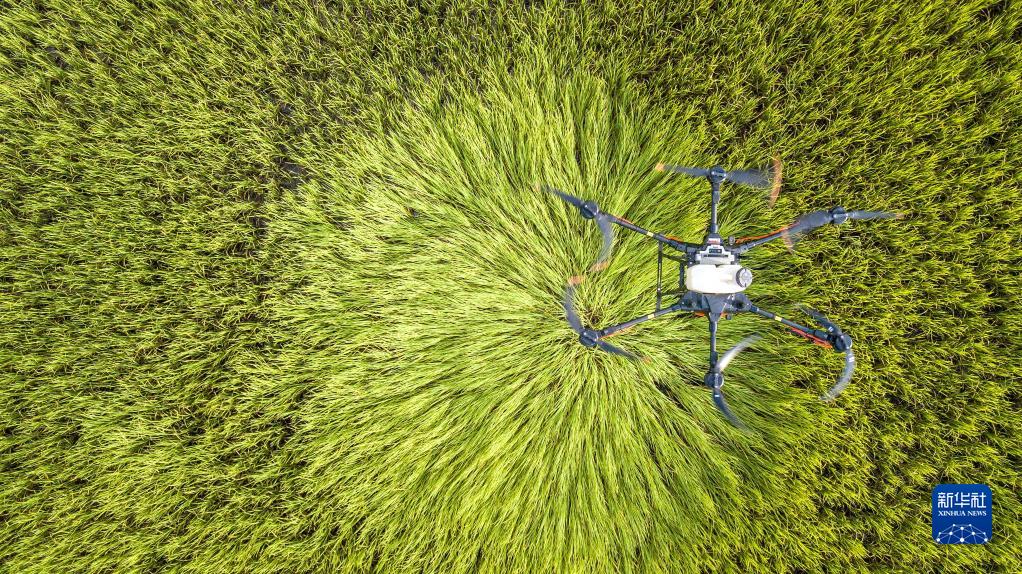8月1日,大疆农业植保无人机在泰国黎逸府喷洒农药(无人机拍摄)。新华社记者 王腾 摄
