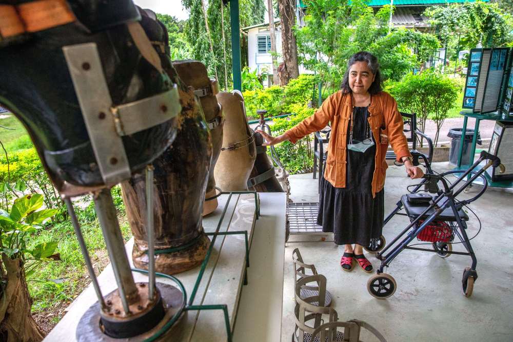 ↑8月6日,在泰国南邦府“亚洲象之友”大象医院,苏赖达·萨瓦拉介绍为大象制作的假肢。