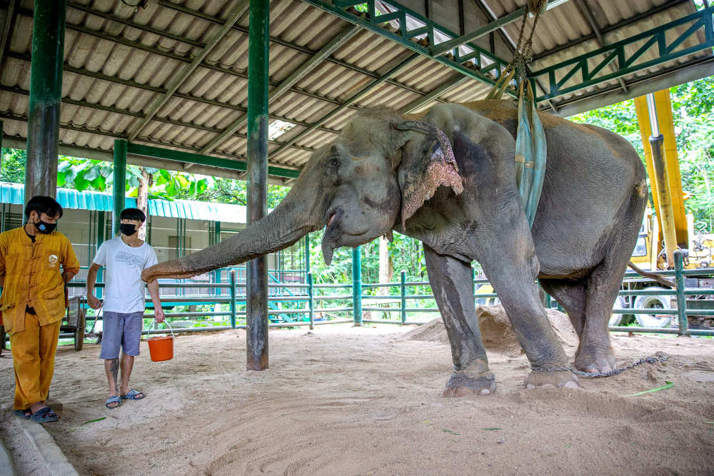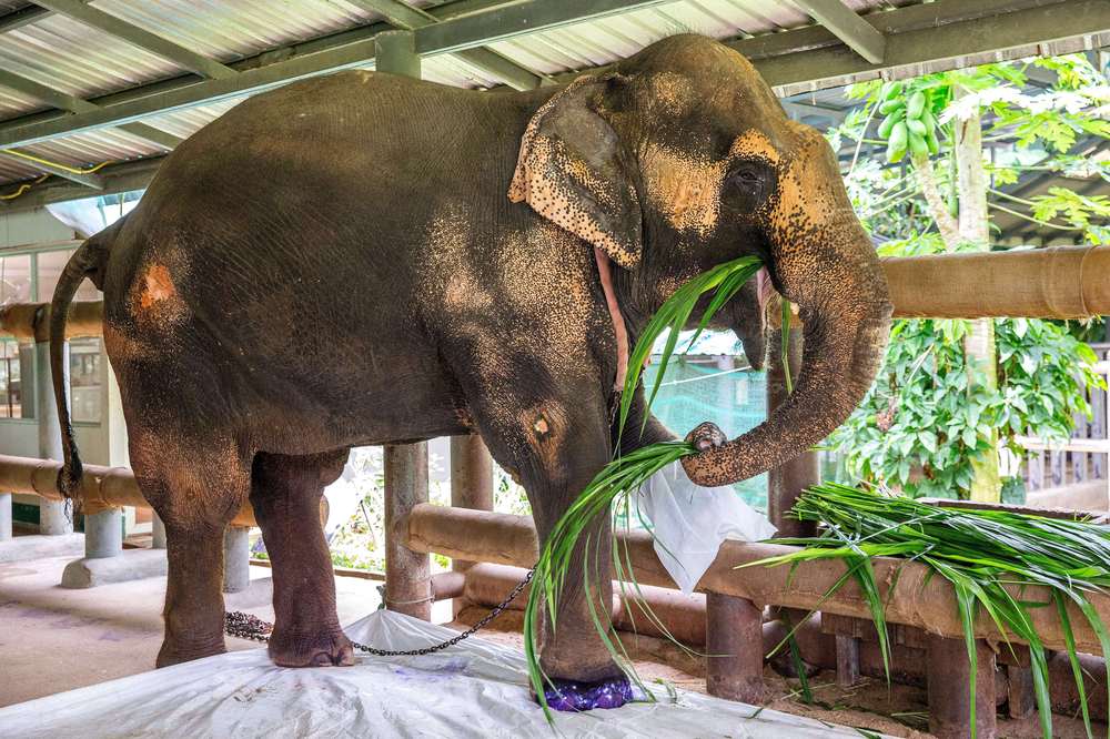 ↑8月6日,在泰国南邦府“亚洲象之友”大象医院,一头受伤的大象在进食。