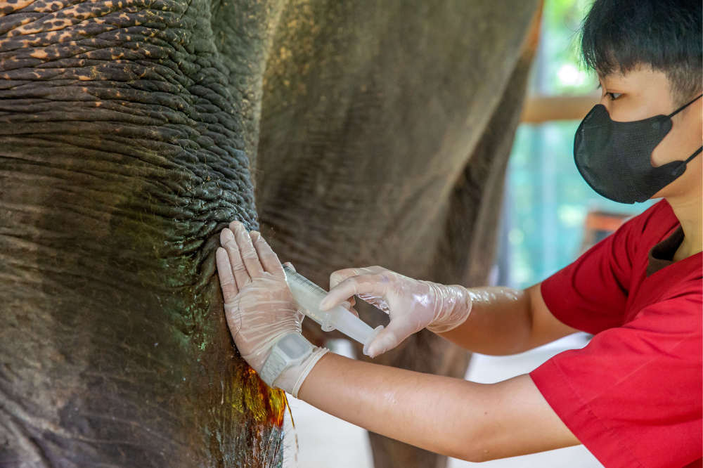 ↑8月6日,在泰国南邦府“亚洲象之友”大象医院,兽医给一头受伤的大象打针。