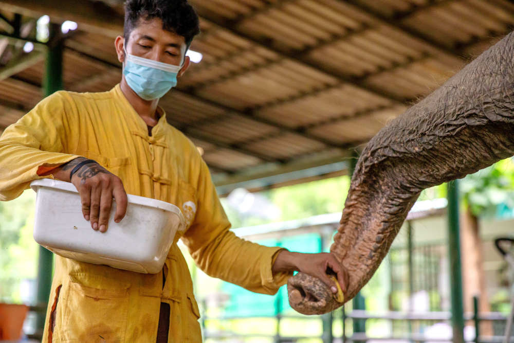 ↑8月6日,在泰国南邦府“亚洲象之友”大象医院,工作人员给一头受伤的大象喂食。
