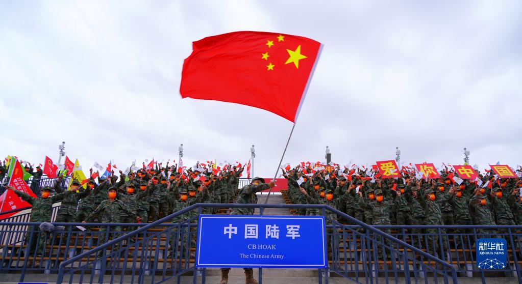 8月13日,“国际军事比赛-2022”中国库尔勒赛区比赛开幕,观众挥动五星红旗加油助威。新华社发(刘洵 摄)