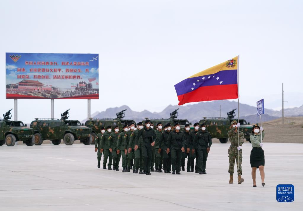 8月13日,“国际军事比赛-2022”中国库尔勒赛区比赛开幕,委内瑞拉参赛队走过主席台。新华社发(栾铖 摄)