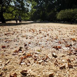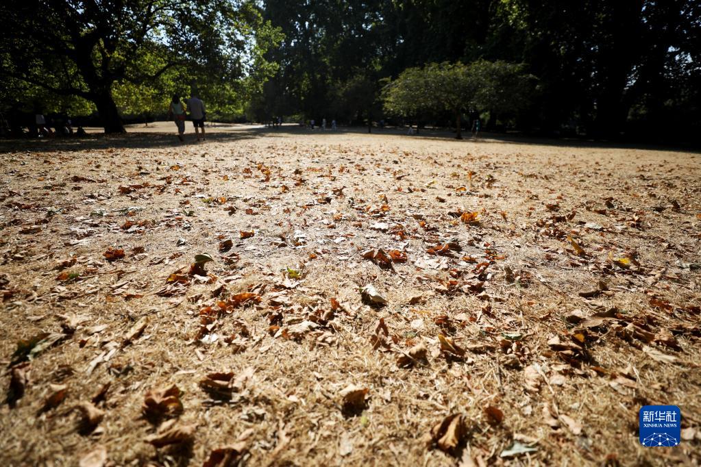 8月13日,在英国伦敦圣詹姆斯公园,人们走过枯黄的草地。