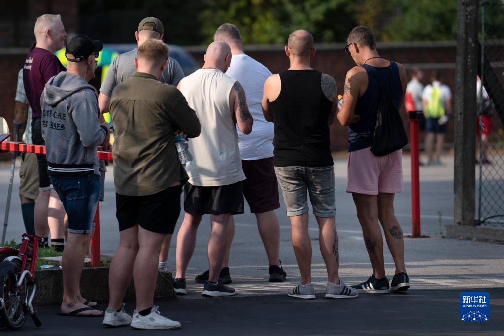 8月14日,人们在英国曼彻斯特一处猴痘疫苗接种点外排队等待接种疫苗。