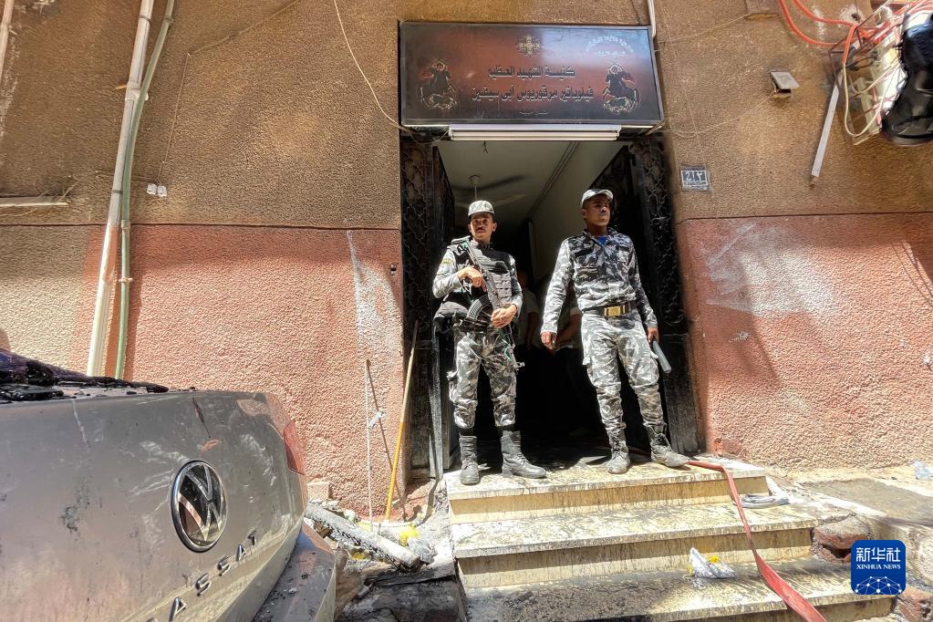 8月14日,在埃及吉萨省,警察在火灾现场执勤。