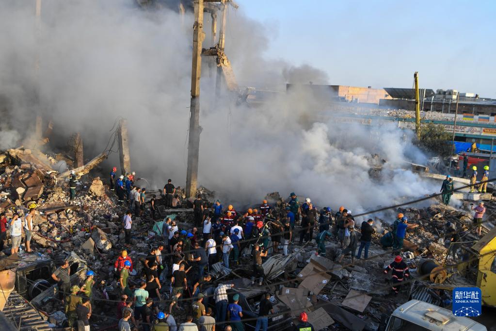 8月14日,救援人员在亚美尼亚首都埃里温的购物中心爆炸现场工作。