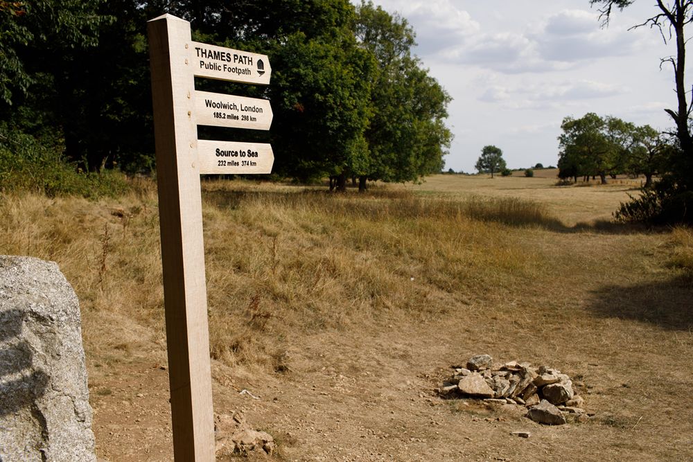 ↑这是8月14日在英国赛伦塞斯特附近拍摄的干涸的泰晤士河发源地和一块写有“泰晤士河起点”的石碑。