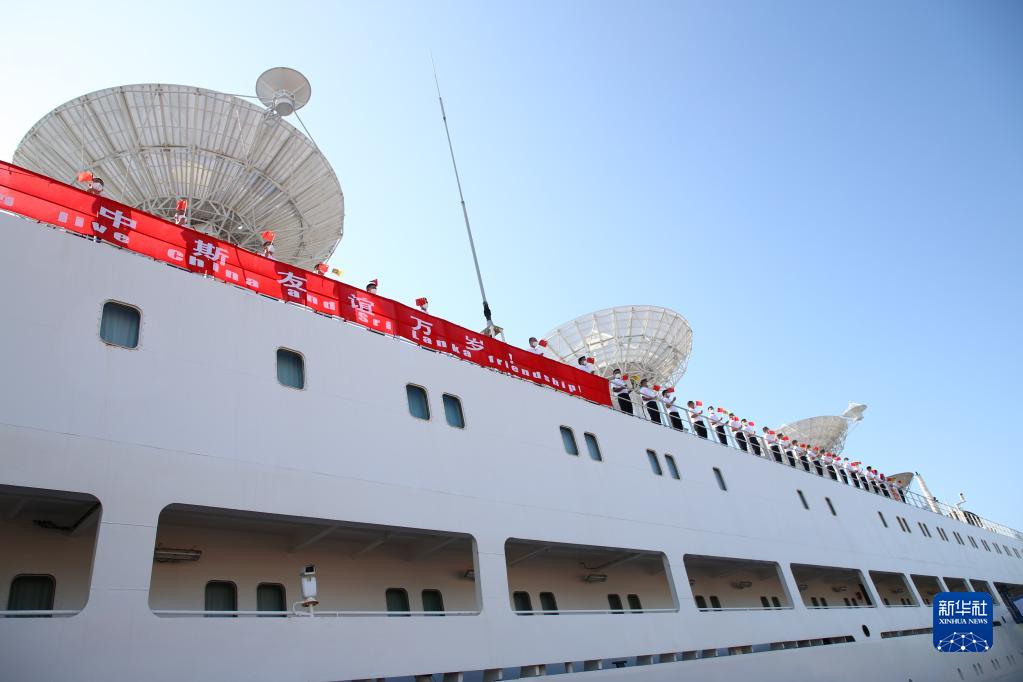 8月16日,在斯里兰卡南部汉班托塔港,中国远望5号船上挂出“中斯友谊万岁”字样的横幅。新华社记者 车宏亮 摄