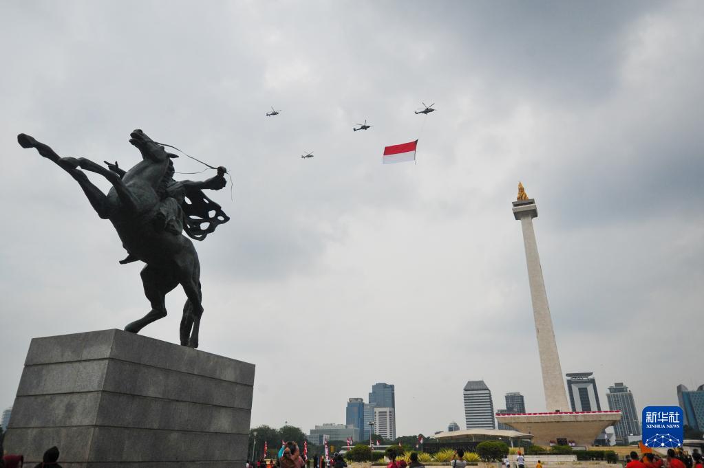 8月17日,悬挂印度尼西亚国旗的飞机编队飞过首都雅加达的民族独立纪念碑上空。