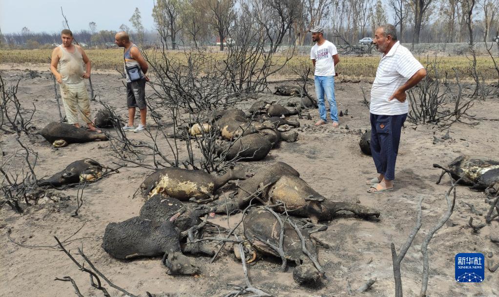 8月18日,在阿尔及利亚泰赖夫省,人们查看被森林火灾烧死的牲畜。