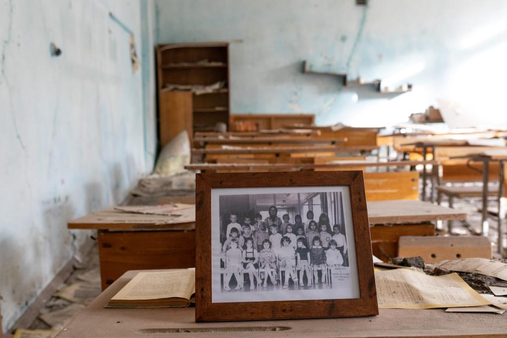 2019年11月12日,在乌克兰北部切尔诺贝利核电站附近的普里皮亚季城,一张集体合影被摆放在废弃的教室内。新华社记者白雪骐摄