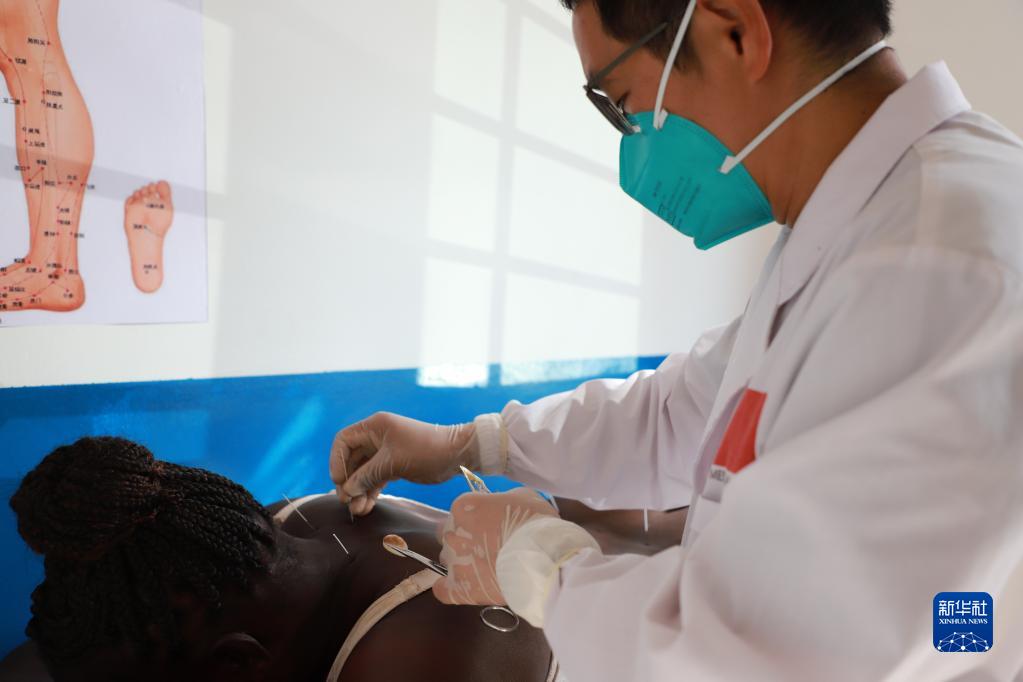 8月19日,在乌干达首都坎帕拉的中乌友好医院,针灸师李晓斌为当地患者进行中医针灸治疗。