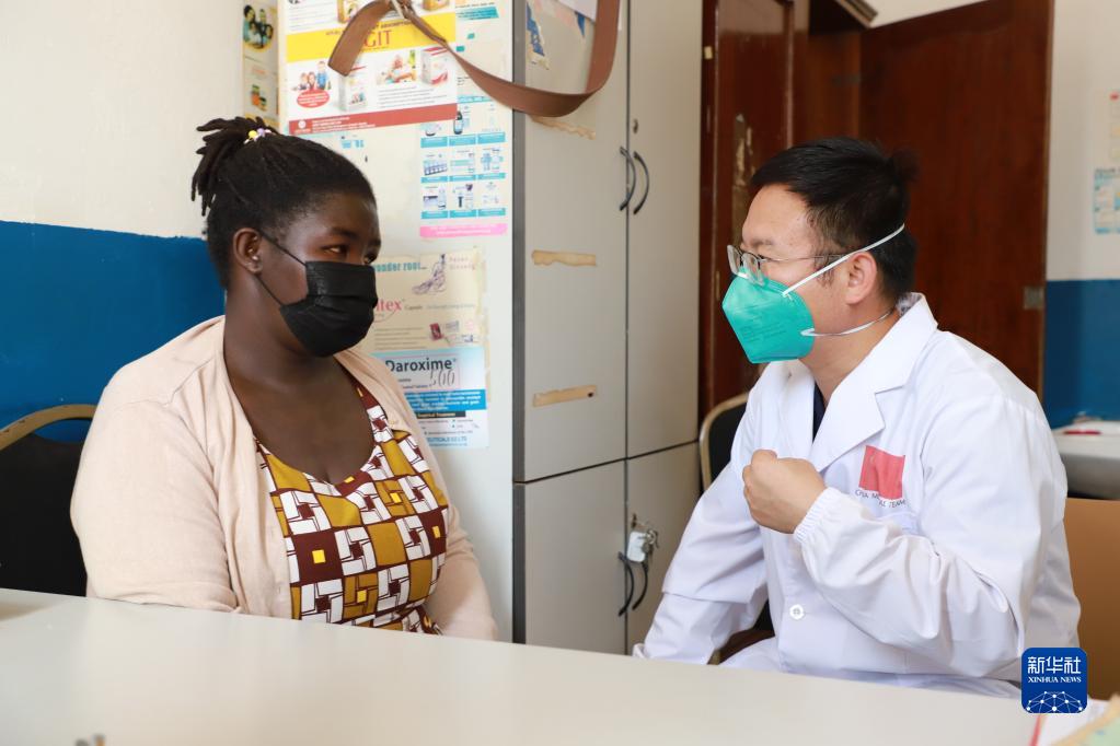 8月19日,在乌干达首都坎帕拉的中乌友好医院,甲状腺乳腺外科医生张辉(右)为患者做诊疗。