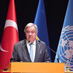8月20日,在位于土耳其伊斯坦布尔的土耳其国防大学内的黑海粮食外运联合协调中心,联合国秘书长古特雷斯出席新闻发布会。