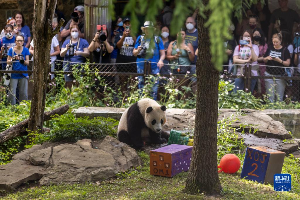 8月21日,在美国华盛顿史密森学会国家动物园,人们在大熊猫幼崽“小奇迹” 两岁生日当天前来参观。