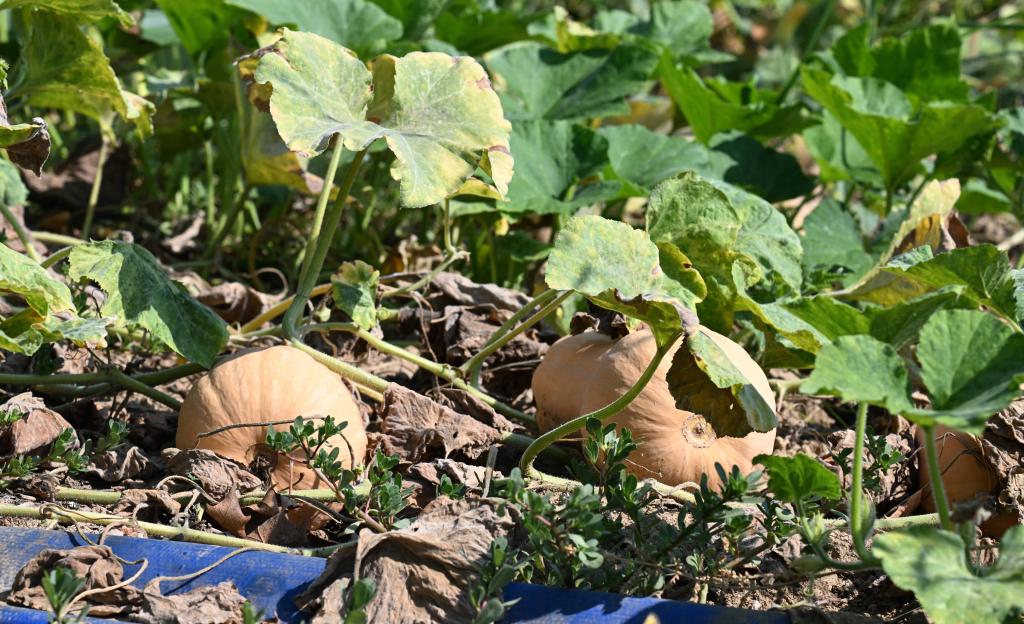 这是8月12日在意大利伦巴第大区曼托瓦拍摄的因干旱受损的南瓜。意大利正在经历70多年来最严重干旱。该国境内最长河流波河流域多段河道干涸,入海口海水倒灌。意大利相关地区农民今年普遍歉收,部分农民损失甚至高达80%。(新华社发,阿尔贝托·林格里亚摄)