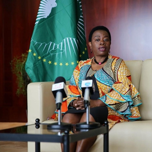 8月22日,非盟委员会副主席莫妮克·恩桑扎巴甘瓦在位于埃塞俄比亚首都亚的斯亚贝巴的非盟总部接受新华社记者采访。她表示,中非合作论坛“九项工程”等中非合作论坛第八届部长级会议成果与非盟《2063年议程》高度契合,将推动非中合作迈向全方位发展。新华社发(哈布塔穆·沃尔库摄)