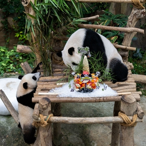 大熊猫妈妈“靓靓”这边则是另一番景象。活泼调皮的“升谊”先是将竹子推倒,一下砸到妈妈的“生日蛋糕”上,然后又和妈妈抢水果。妈妈想静静休息的时候,“升谊”爬上爬下,极力凑到妈妈身上,想拉妈妈起来陪自己玩。