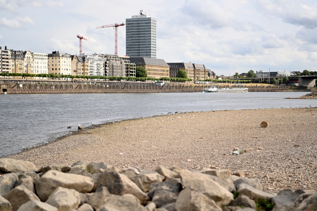 这是7月26日在德国杜塞尔多夫拍摄的莱茵河。受高温和干旱影响,德国莱茵河水位下降。新华社发