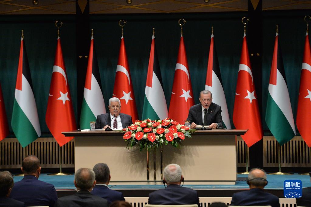 8月23日,土耳其总统埃尔多安(右)在首都安卡拉与到访的巴勒斯坦总统阿巴斯举行联合记者会。