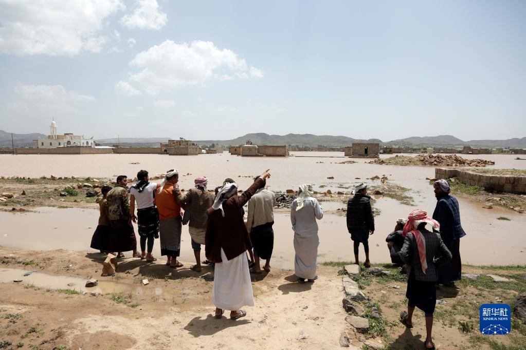 8月23日,在也门扎马尔省马巴尔地区,人们查看被洪水淹没的土地。