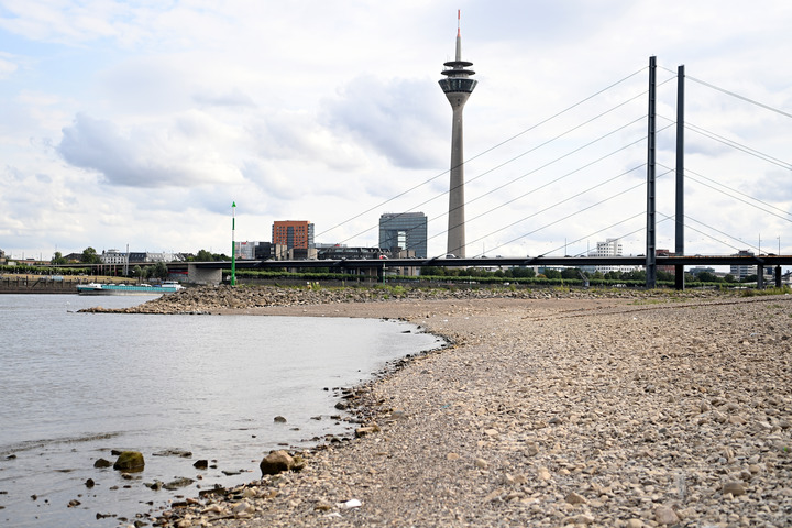 这是7月26日在德国杜塞尔多夫拍摄的莱茵河。受高温和干旱影响,德国莱茵河水位下降。新华社发(乌尔里希·胡夫纳格尔摄)
