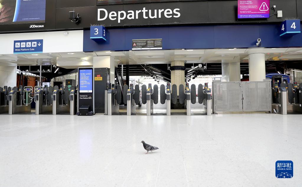 8月20日,一只鸽子走在英国伦敦滑铁卢火车站大厅内。在通货膨胀的影响下,由于薪酬、养老金等问题,英国铁路员工在8月20日举行罢工。新华社记者 李颖 摄