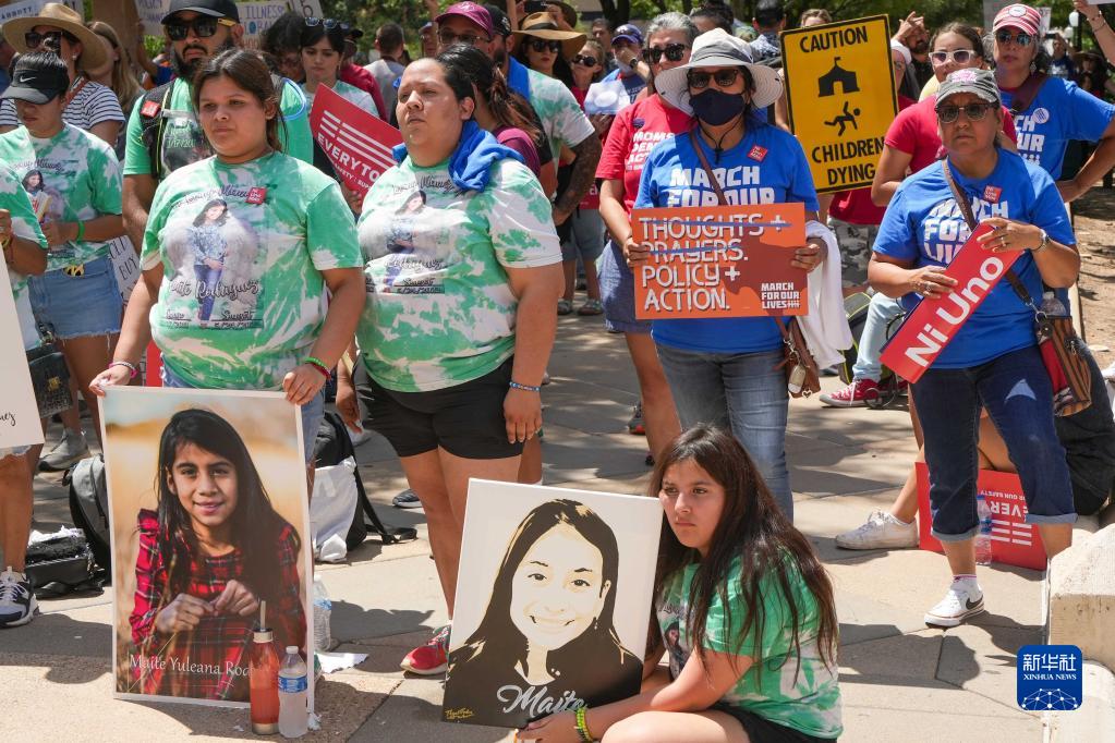 当日,包括得州小学枪击案遇难者亲属在内的抗议者在奥斯汀市举行集会呼吁控枪。5月24日发生在得州尤瓦尔迪市罗布小学的枪击案造成19名小学生和两名教师死亡,震动全美。