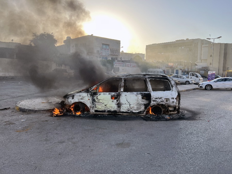 这是8月27日在利比亚首都的黎波里拍摄的损毁的汽车。新华社发(哈姆扎·图尔基亚摄)