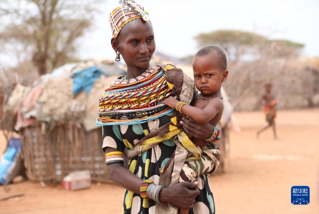 8月26日,一名女子抱着孩子站在肯尼亚马萨比特郡莱萨米斯镇一干旱的村庄内。